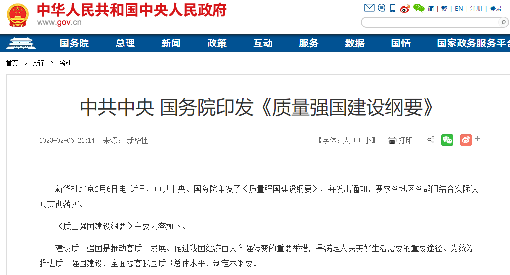 近日,中共中央、國(guó)務(wù)院印發(fā)了《質(zhì)量強(qiáng)國(guó)建設(shè)綱要》,并發(fā)出通知,要求各地區(qū)各部門結(jié)合實(shí)際認(rèn)真貫徹落實(shí)。