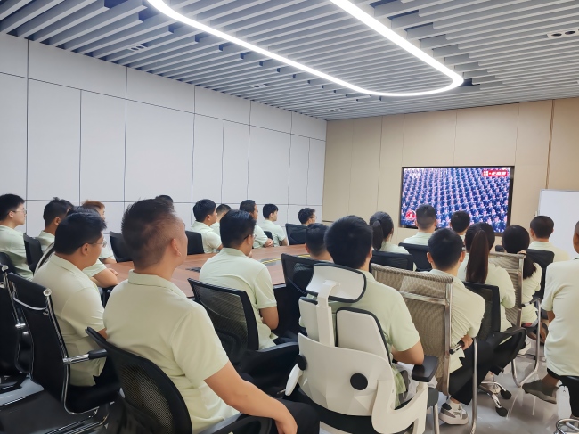 隨著閱兵盛典的開始,全體員工已整裝待發,或坐在各自的辦公室,或聚集在五樓大會議室,共同期待著閱兵式的開始。這一刻,每個人的心中都充滿了對歷史的敬畏與對和平的珍惜。直播畫面中,雄壯的國歌聲響起,鮮艷的五星紅旗冉冉升起,那一刻,我們仿佛穿越了時空,回到了那個烽火連天的年代。無數先烈用鮮血和生命換來了今天的和平與繁榮,他們的英勇事跡將永遠銘記在我們心中。